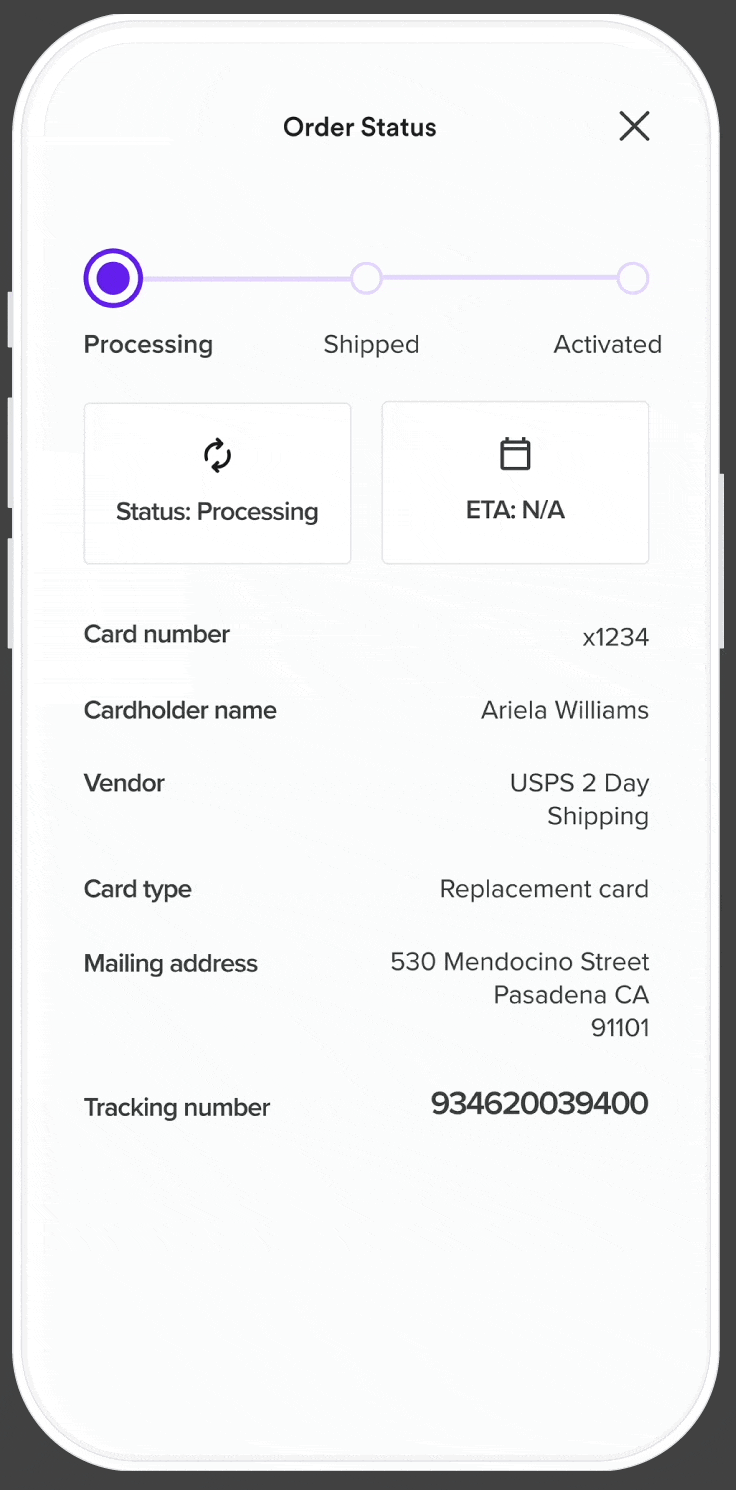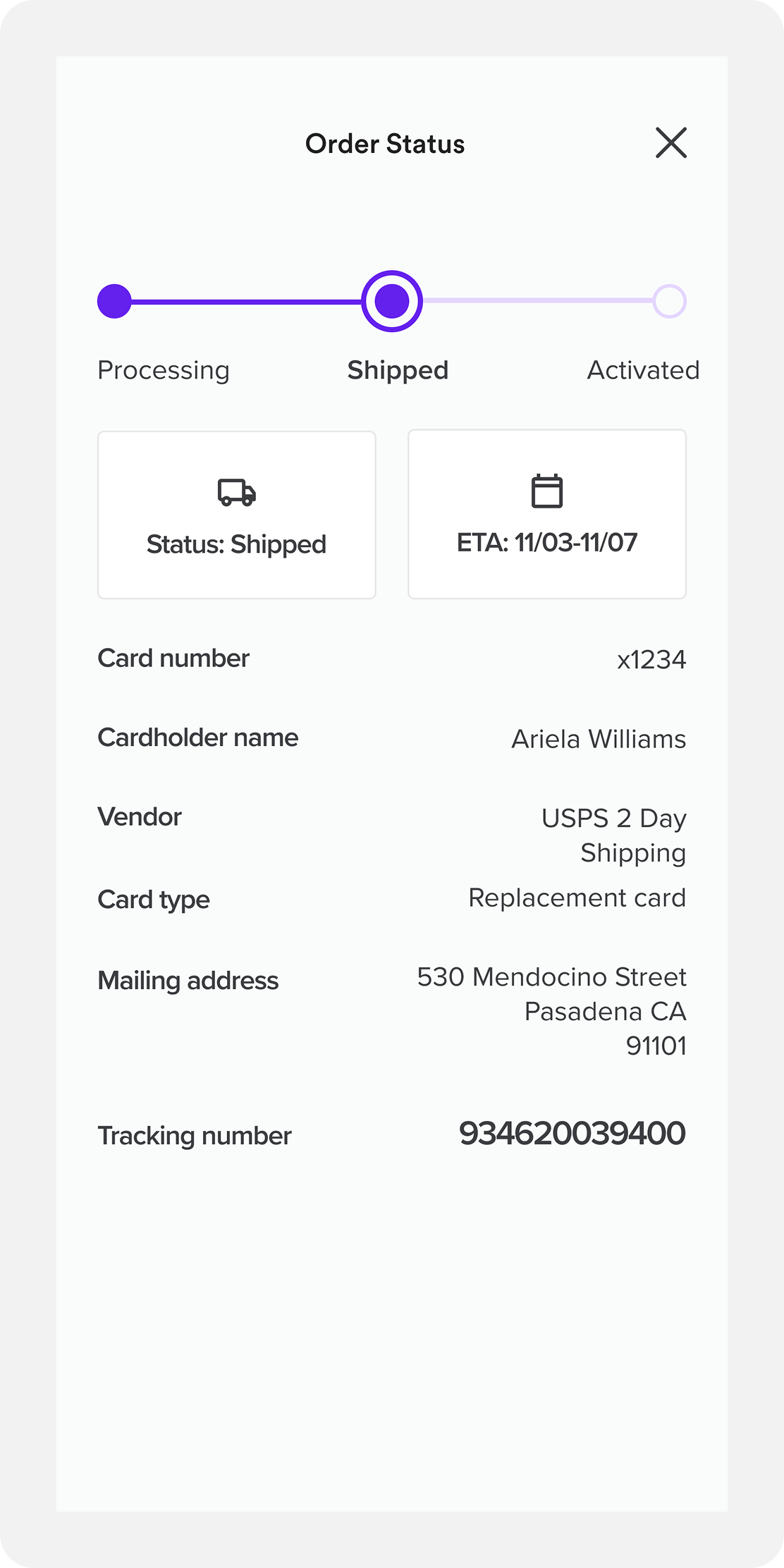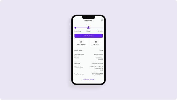 The card order status page provides detailed updates about the status of the card. It predicts any potential blockers users may have during card delivery and also identifies opportunities to complete onboarding.
