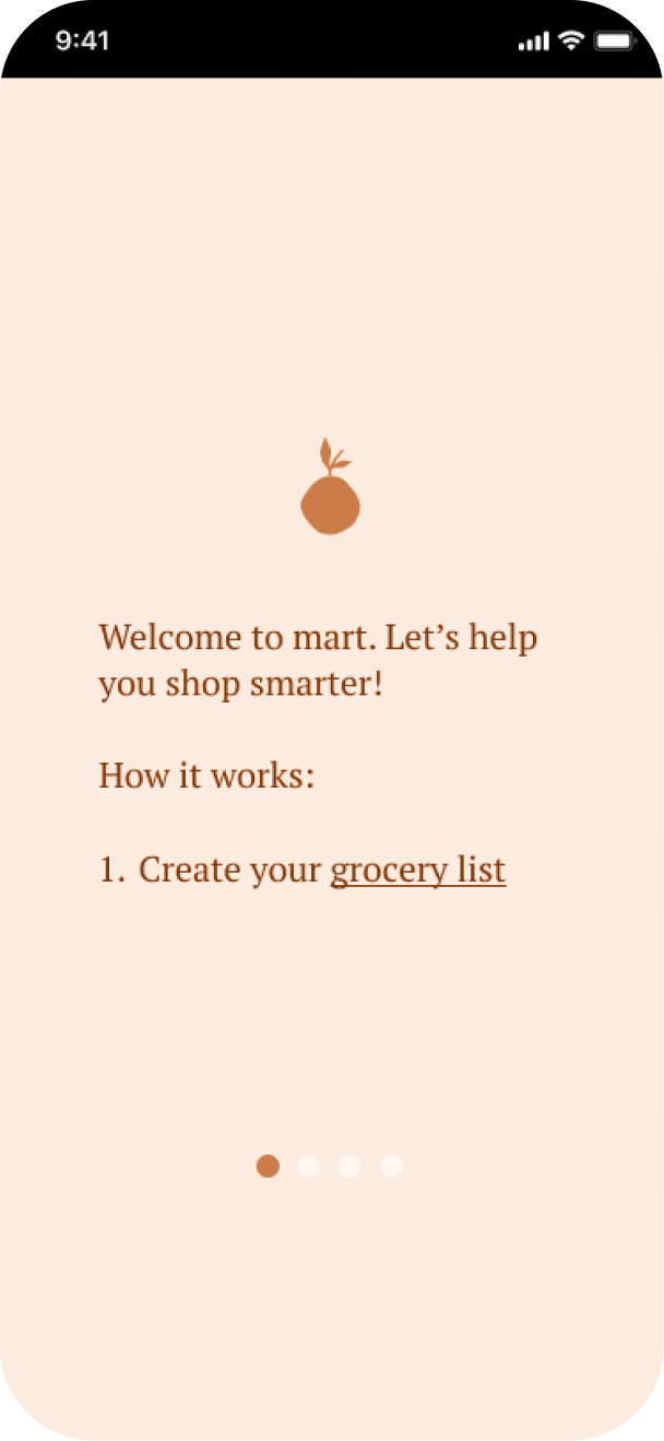 In the onboarding screens, first-time users can swipe to understand how to use mart. The design is simple and minimalistic to allow users to focus on the most important information.