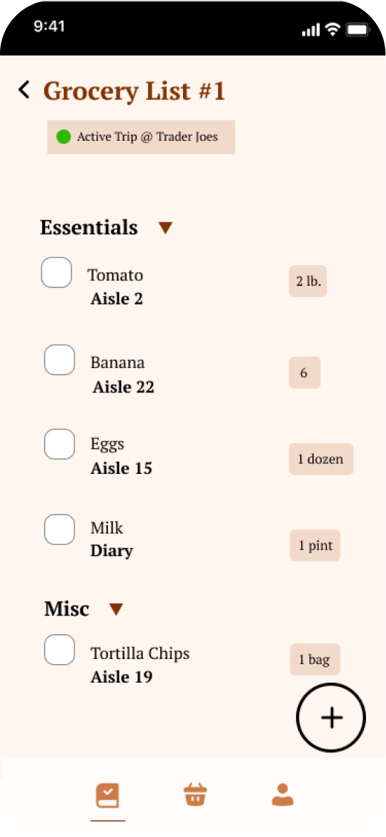 Users can save their list or begin trip which will then set an active trip that will help users find their grocery items.
