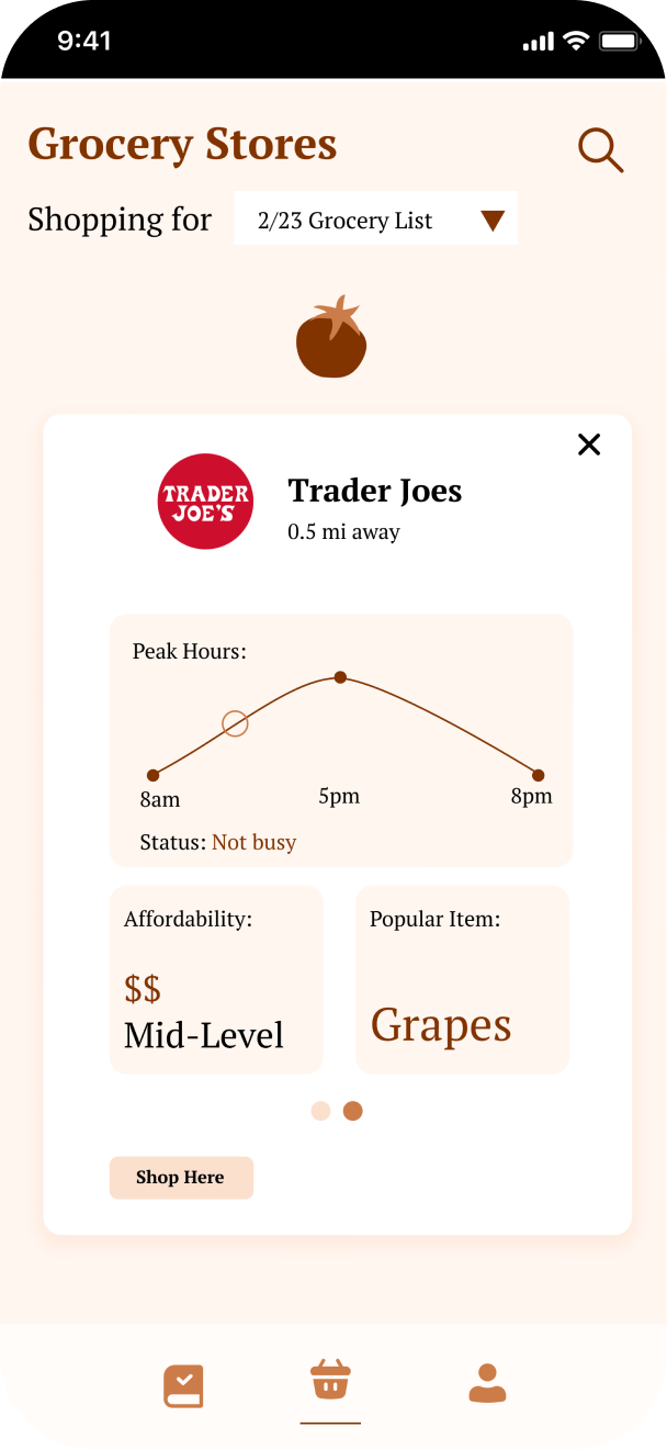 Here, users will be able to search for grocery stores in their area and sort through them according to the items on their grocery lists. Information about the grocery store, such as the peak hours, affordability, and popular items will be displayed.